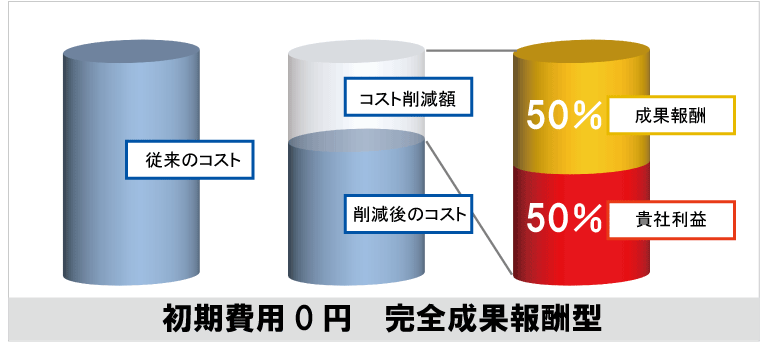 | 成果報酬 | コスト削減額の50% | 1年間分の削減額の50%分を、成功報酬額とさせていただきます。 |