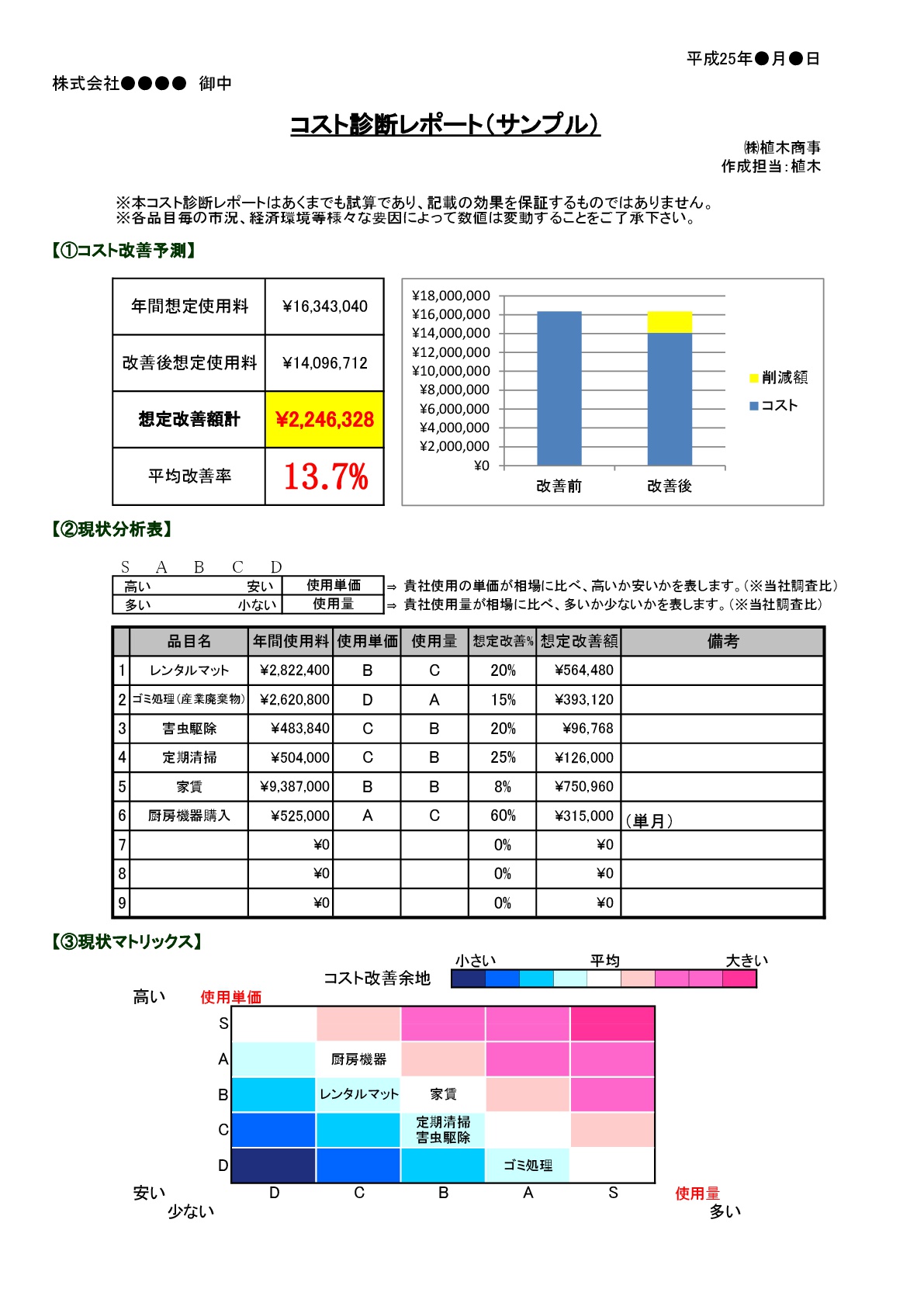 | 1 | レンタルマット | ¥378,000 | A社 | 現状しがらみは無いので、変更はOK。 |