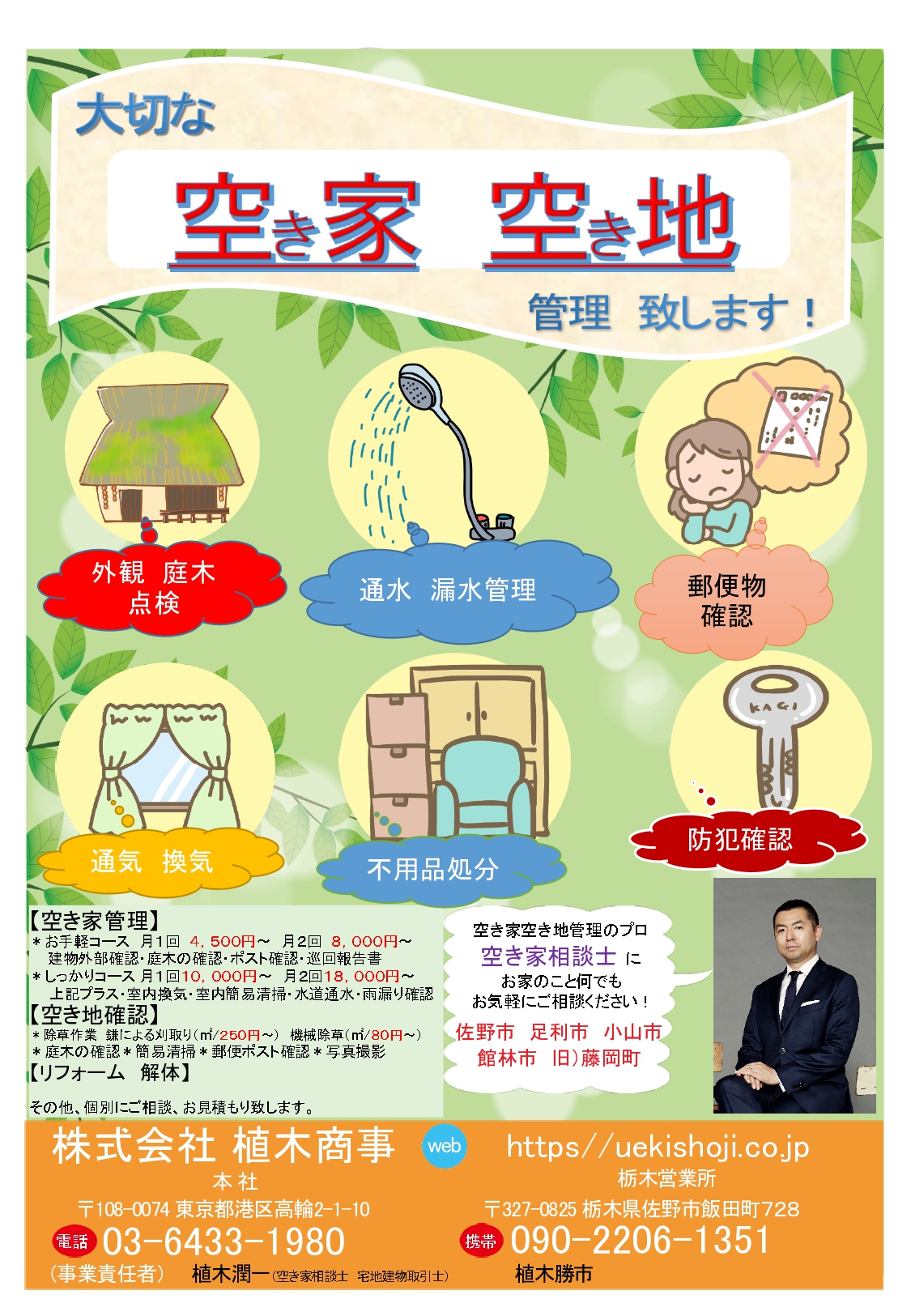 植木商事では、国土交通省の、レポートにありますように、 管理不全な 空き家・空き地のデメリットの改善及び、 それに付帯する解体・リフォーム 管理及び対策サポートを行います。 参照:国土交通省ページ 対応エリア 詳細については、今後随時更新をさせてもらいます。 2018年9月吉日 代表取締役 植木潤一 登録番号(1)第001199号 参照:一般社団法人 全国空き家相談士協会